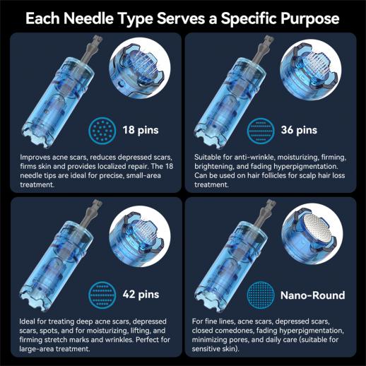 - * 【Präzisions-Nadeltiefe auf Mikron-Ebene】Erleben Sie unvergleichliche Kontrolle mit drei präzisen Tiefeneinstellungen (0.0 mm, 0.2 mm und 0.2 mm). Dieses Microneedling-Gerät ermöglicht es Ihnen, die Nadeltiefe individuell auf Ihre spezifischen Hautprobleme und Behandlungsbereiche abzustimmen. Ob Sie feine Linien um die Augen behandeln, tiefere Aknenarben angehen oder einfach die Aufnahme von Wirkstoffen verbessern möchten – die Mikron-Level-Anpassung sorgt dafür, dass aktive Inhaltsstoffe genau dort wirken, wo sie am meisten benötigt werden, für optimale Ergebnisse.