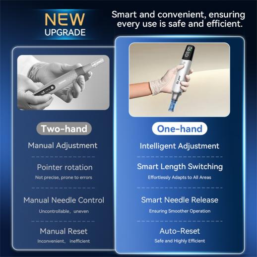 Erleben Sie die Zukunft der Hautpflege mit dem Smart Precision Needle Adjustment Device. Entwickelt für professionelle Kosmetikerinnen und den Heimgebrauch, bietet dieser Microneedling-Pen micron-genau einstellbare Nadeltiefen (0.0 mm, 0.2 mm, 0.2 mm) für präzise und personalisierte Behandlungen. Mit der einfachen Ein-Knopf-Steuerung können Sie die Nadellänge mühelos an spezifische Hautprobleme anpassen – sei es für feine Linien, Aknenarben oder allgemeine Hautverjüngung. Verabschieden Sie sich von komplizierten Einstellungen und genießen Sie eine einfache, effektive Hautpflege.