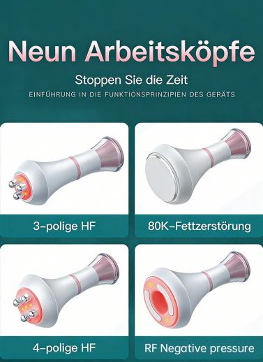 - * 【Anpassbare Behandlungen】: Verfügt über einstellbare Energiestufen, mehrere Modi und austauschbare Köpfe, um Behandlungen für verschiedene Körperbereiche anzupassen, was die Benutzerzufriedenheit und die Behandlungseffizienz mit dem 9-in-1 Körperstraffungsgerät erhöht.
