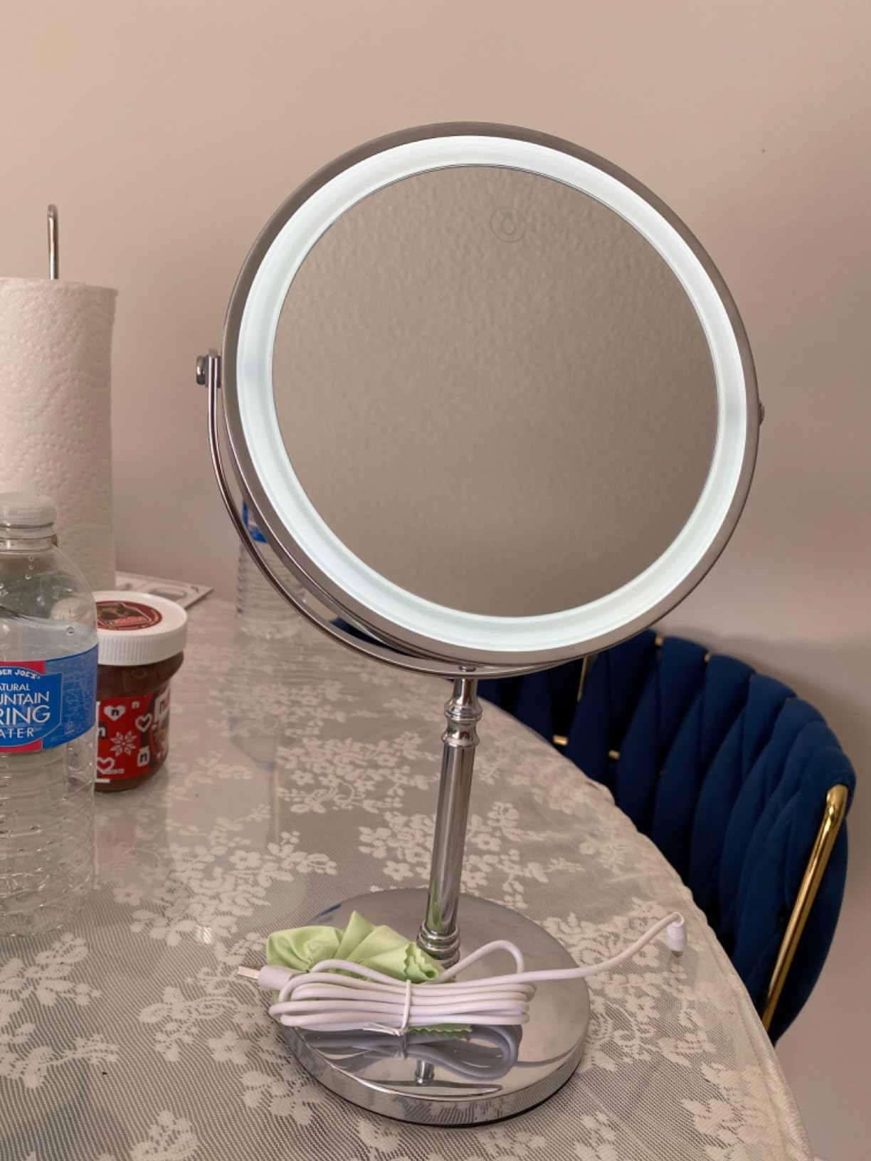 Ich LIEBE die Tatsache, dass man ihn aufladen kann, sodass er nicht aktiv eingesteckt werden muss, um ihn zu verwenden. Das ist großartig, weil so weniger Kabel im Raum herumliegen. Die LED-Leuchten sind leuchtend und das Material ist authentisch. Außerdem wird ein Tuch mitgeliefert, mit dem man Fingerabdrücke vom Spiegel wischen kann. Außerdem ist er doppelseitig, sodass man ihn für eine Nahaufnahme einfach umdrehen kann. Ich liebe diesen Spiegel. Er sieht überall toll aus.