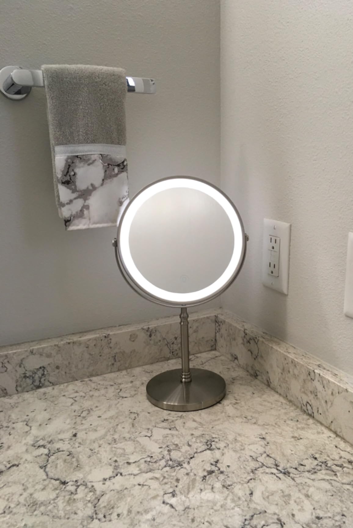 8-Zoll-Spiegel mit 7-facher Vergrößerung auf einer Seite und einstellbarer Beleuchtung, die alle hervorragend funktionieren. Leicht wiederaufladbar. Nimmt sehr wenig Platz auf meinem Schminktisch ein und hat einen stabilen Standfuß.