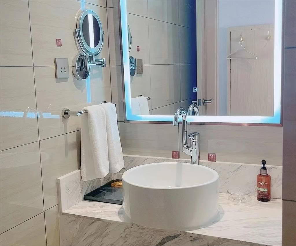 Dieser Vergrößerungsspiegel ist sehr vielseitig und kann mit verschiedenen Lichtfarben unterschiedliche Bereiche des Gesichts hervorheben.