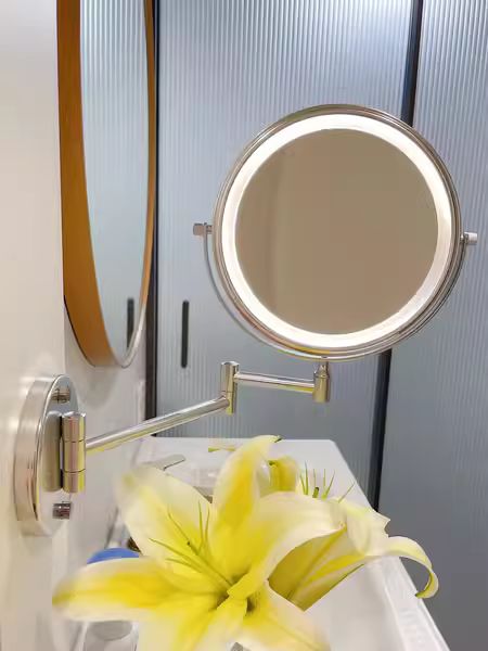Damit kann ich mein Gesicht wirklich ganz nah und persönlich betrachten. Da ich Augenprobleme habe, finde ich das toll. Ich benutze das mitgelieferte Licht nicht, daher kann ich nicht sagen, wie gut es funktioniert. Meines ist jetzt an der Wand befestigt und bleibt dort, was sehr gut ist. Das alte hatte ich am Spiegel „festgeklebt“ und es fiel etwa alle 6 Monate ab. Das erwarte ich von diesem nicht. Es lässt sich zum Betrachten leicht herausschwenken und zum Wegräumen wieder einschwenken.