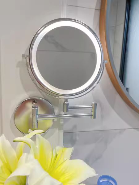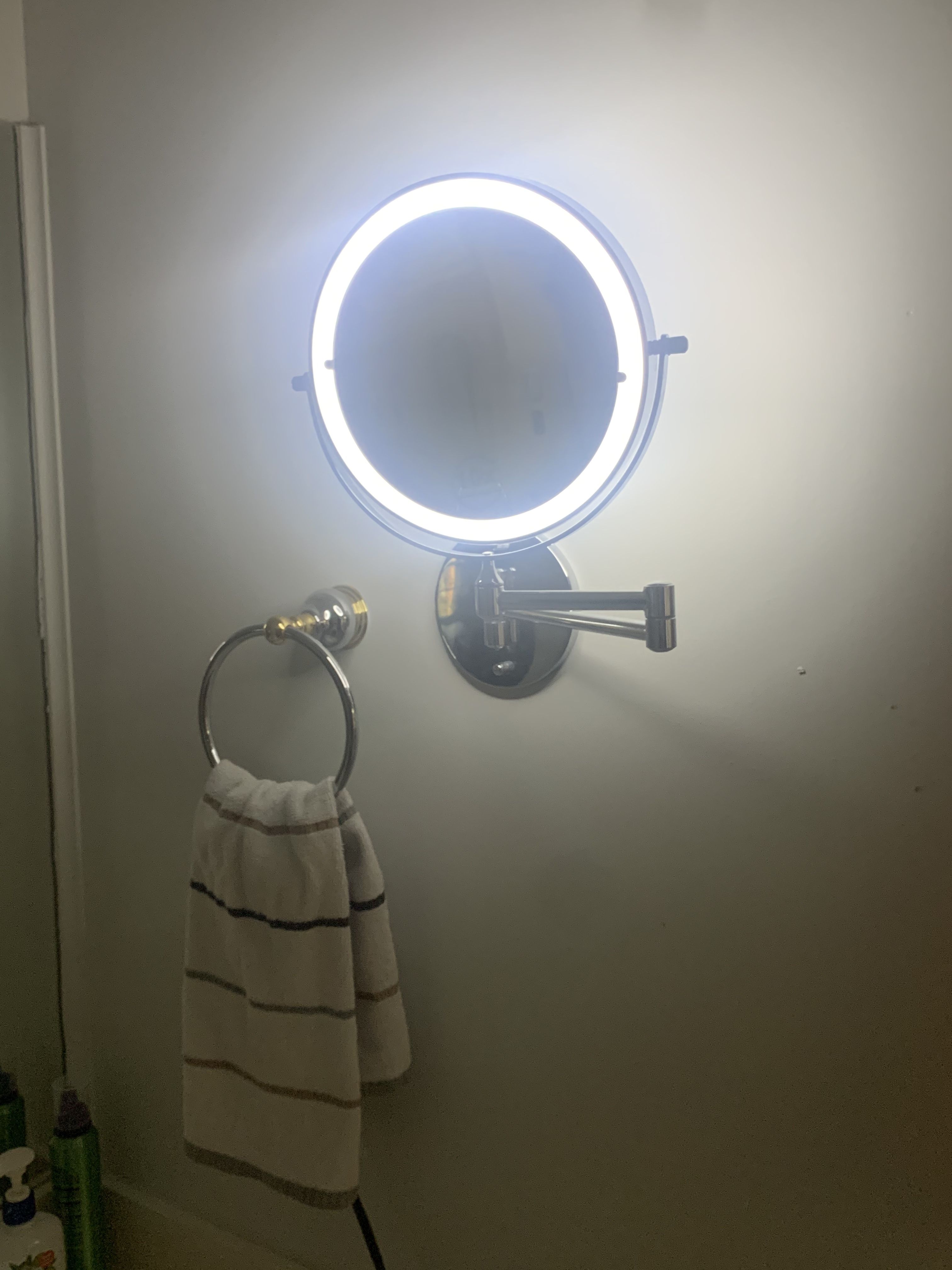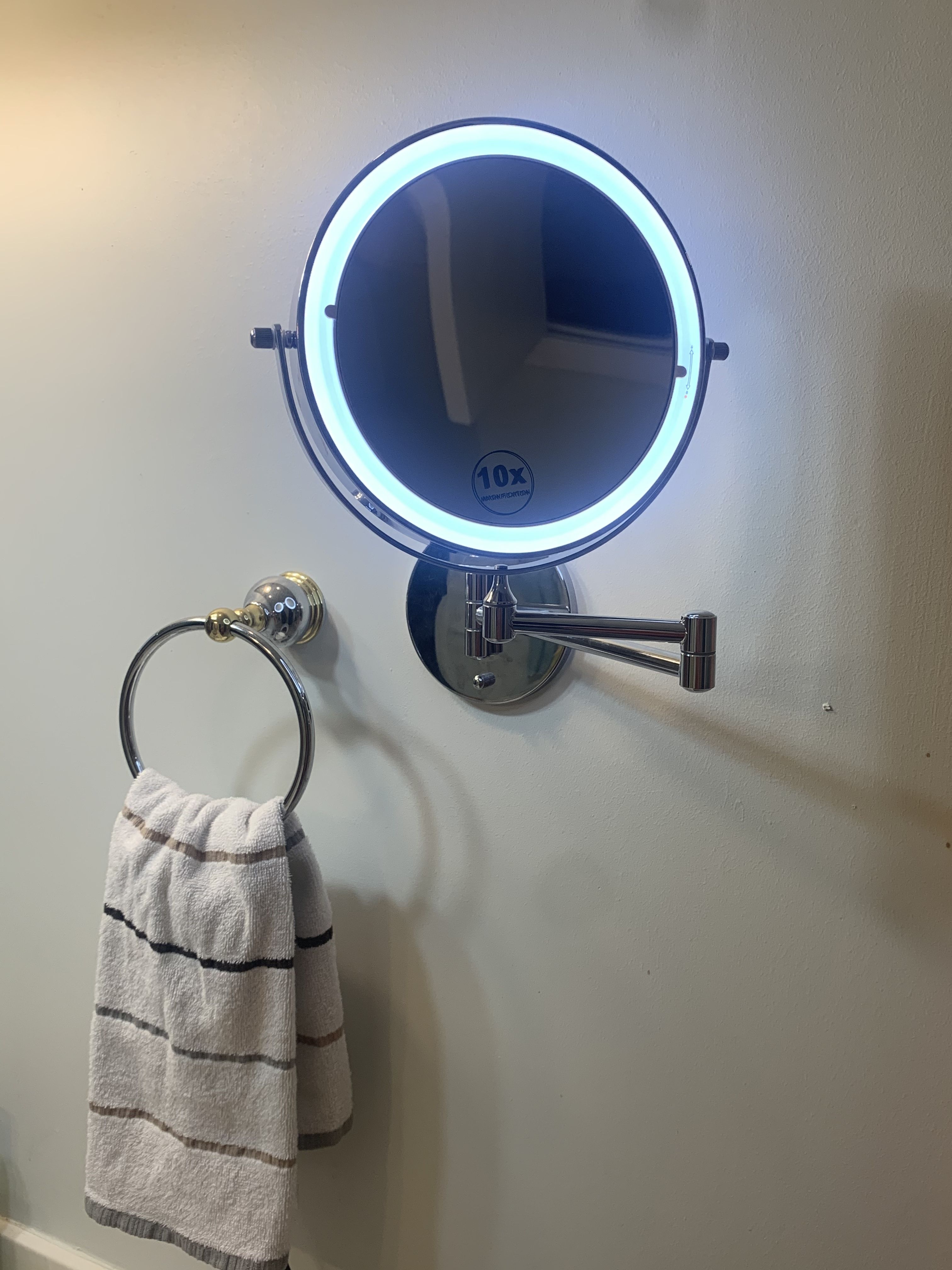 Gekauft, um einen unbeleuchteten Spiegel zu ersetzen, der schon seit vielen Jahren abgenutzt war. Ich habe den Spiegel sicher an der Wand befestigt, indem ich ihn an einem Bolzen in der Wand befestigt habe. Obwohl der Spiegel mit Wanddübeln geliefert wird, hatte ich das Gefühl, dass sie sich durch ständigen Gebrauch irgendwann lösen würden. Nachdem ich den Akku aufgeladen hatte (ich habe ein iPad-Ladegerät verwendet), habe ich den Spiegel durch Berühren des Spiegelschalters „eingeschaltet“ und mit allen Funktionen gespielt. Ups – Zeit, meine Fingerabdrücke vom Spiegel zu entfernen. Ich bin besonders zufrieden mit der 10-fachen Seite – sehr klar und unverzerrt.