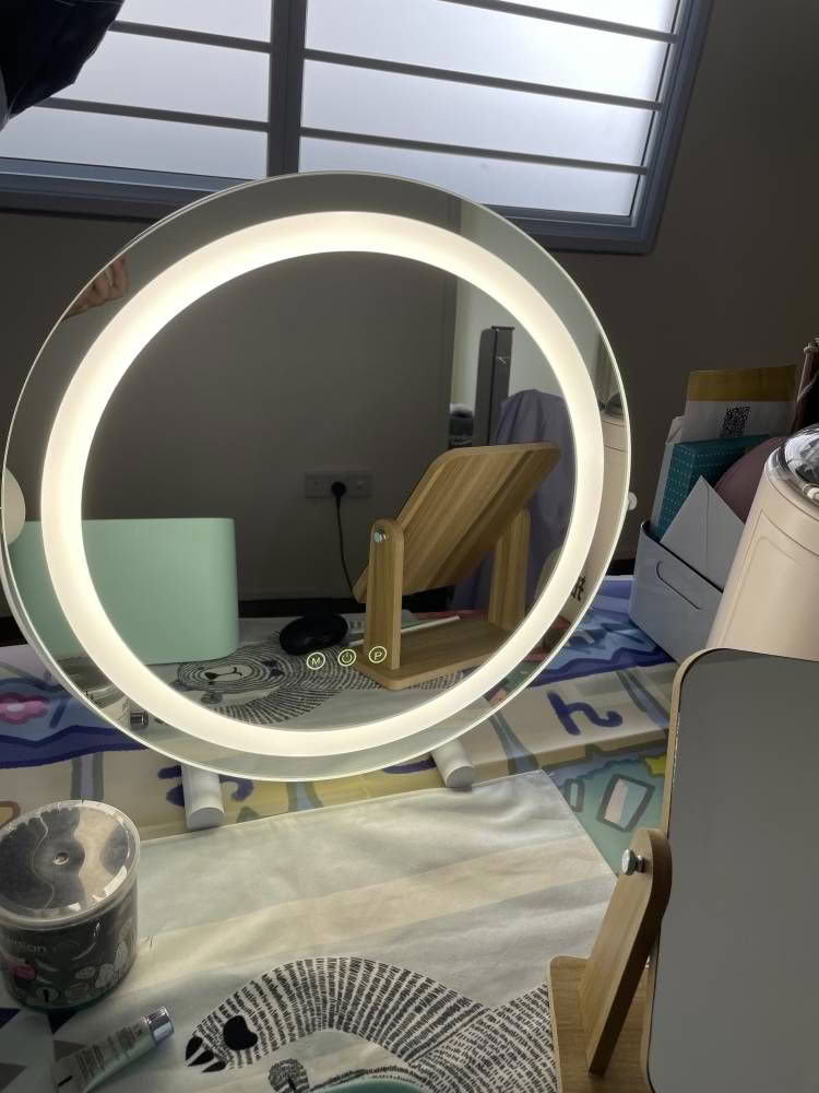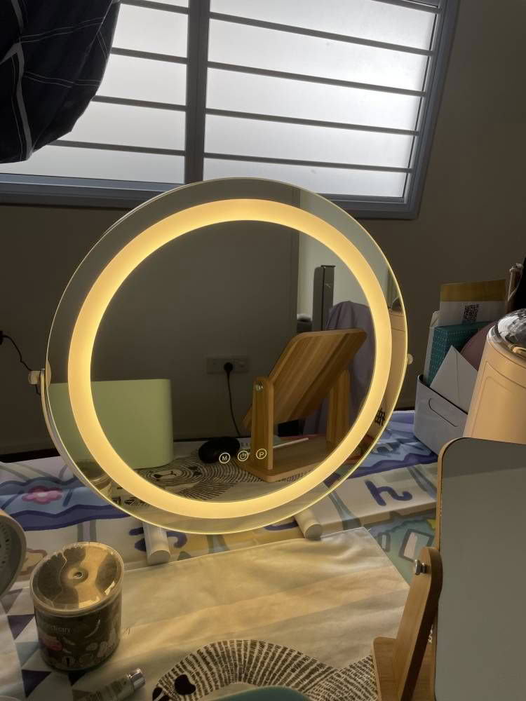 Ich liebe diesen Spiegel! Es hat die perfekte Größe für meine kleine Kommode. Es verfügt über drei Helligkeitseinstellungen, was perfekt ist, da ich mich so im Dunkeln fertig machen kann, während mein Verlobter (der in der Nachtschicht arbeitet) tagsüber schläft. Es ist einfach einzustellen und zu bewegen!