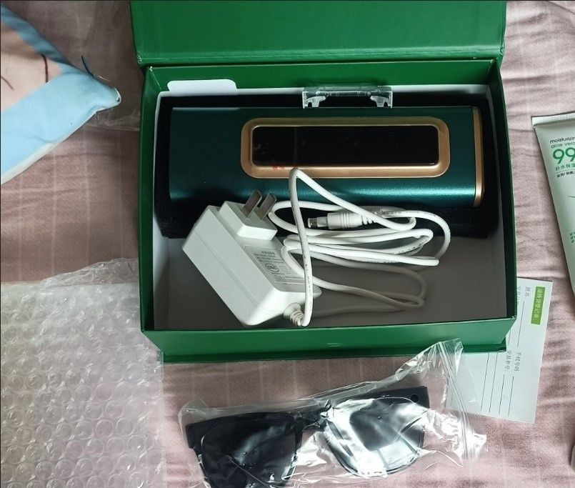 Es ist sehr gut verpackt und wird mit allem geliefert, was man braucht, einschließlich einem Rasierer (ich persönlich habe meinen eigenen verwendet, weil meine Haut empfindlich ist, besonders bei einem billigen Rasierer), einer Schutzbrille und einem langen Ladekabel. Es ist wirklich von guter Qualität und funktioniert bisher ziemlich gut.