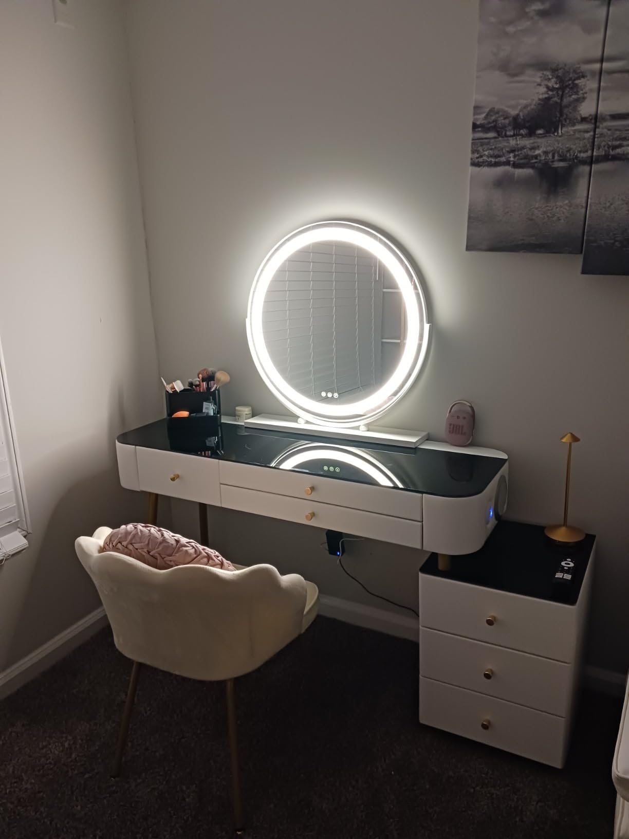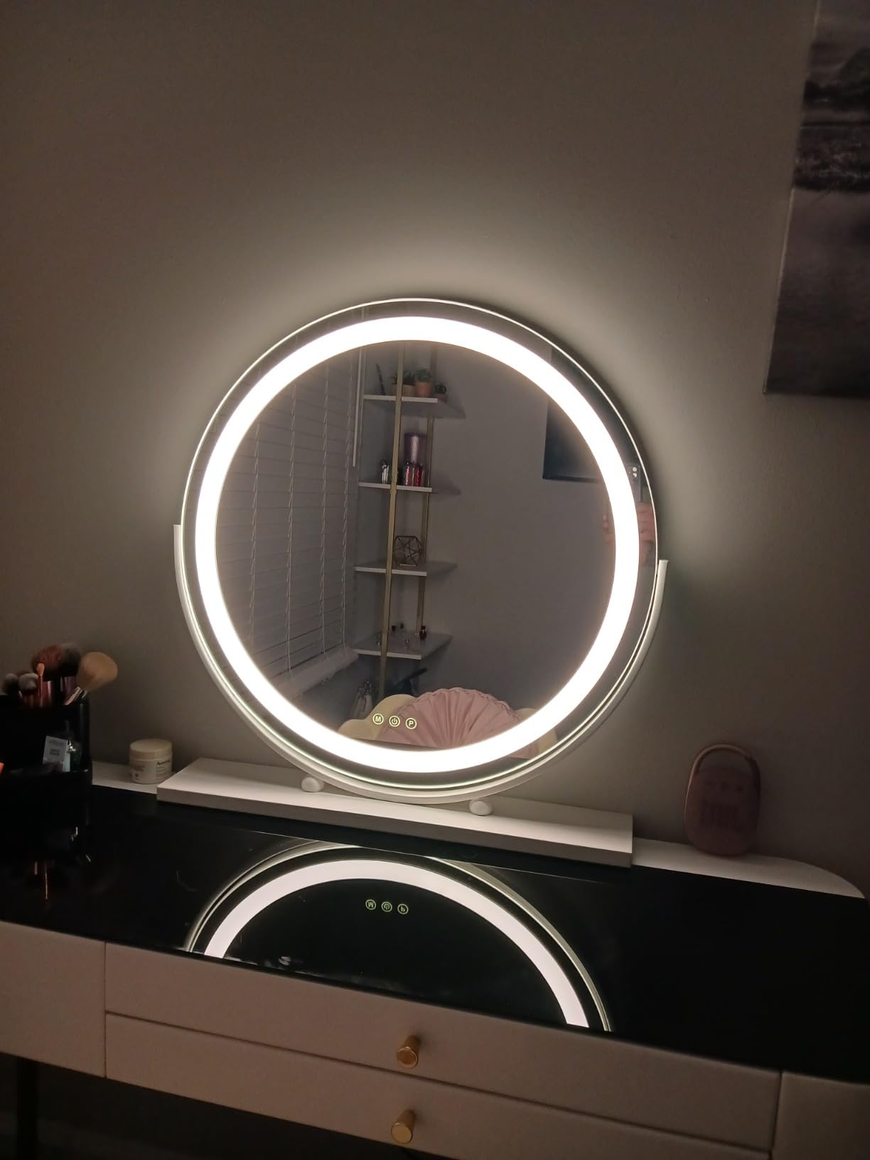 Habe das für meinen Schminktisch gekauft. Ich habe eine Weile gebraucht, um zu entscheiden, ob ich einen runden Spiegel wie diesen oder den Hollywood-Spiegel mit den Glühbirnen kaufen wollte. Ich bin froh, dass ich mich für diesen entschieden habe. Zum einen sind die drei hellen Farbtöne großartig zum Schminken und es sieht professionell aus. Hoffentlich hält es eine Weile, da ich nicht jeden Tag Make-up trage. Außerdem habe ich es im Angebot gekauft ... das ist immer ein Plus!