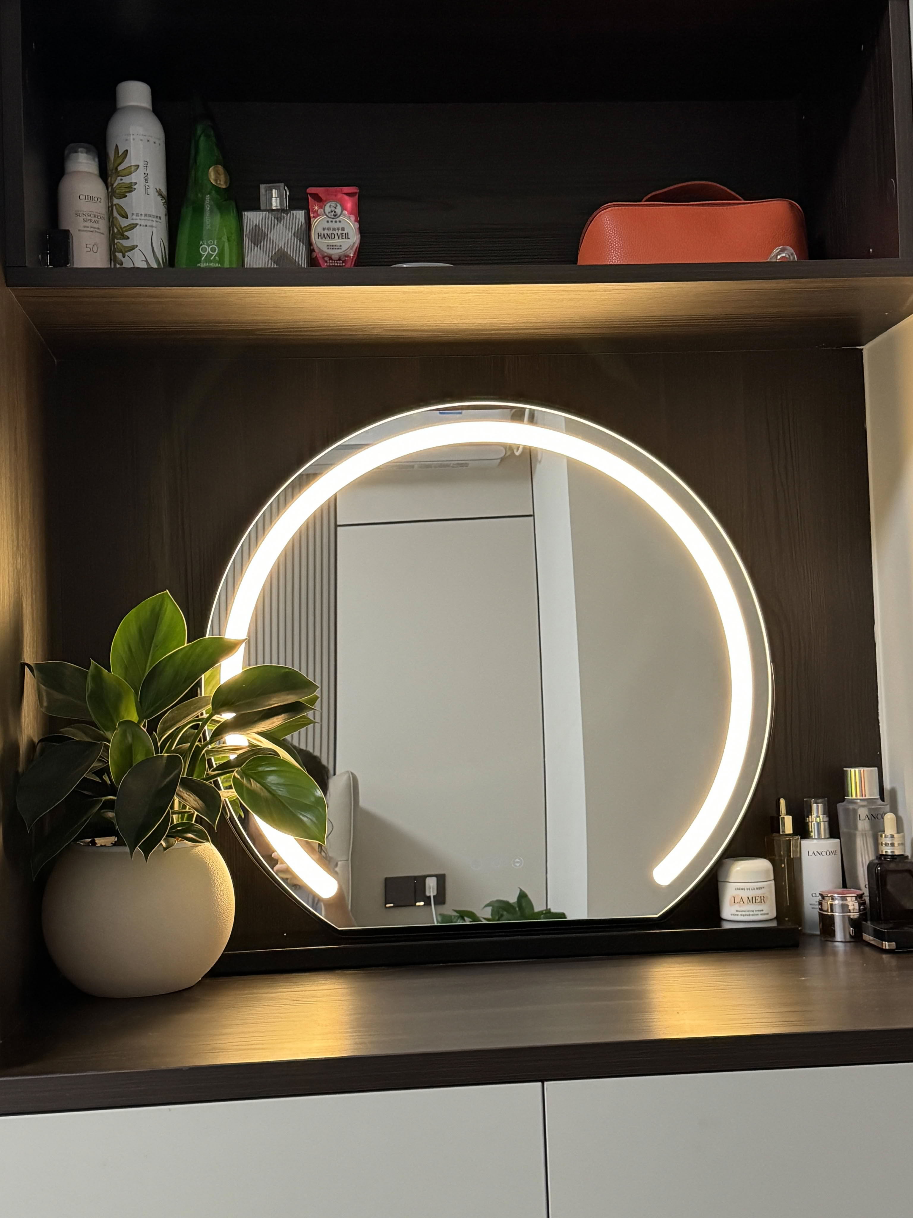 Ich war überrascht, wie gut es mir gefallen hat. Das Licht ist in den ersten Einstellungen nicht so stark, aber in der letzten Einstellung ist das Licht perfekt. Es sieht auf meinem Schminktisch wirklich gut aus, im Gegensatz zu einem typischen billigen beleuchteten Schminkspiegel. Ich wollte etwas, das hochwertig aussieht, damit ich mein gesamtes Gesicht aus der Ferne oder aus der Nähe sehen kann, und dieser Spiegel ist großartig