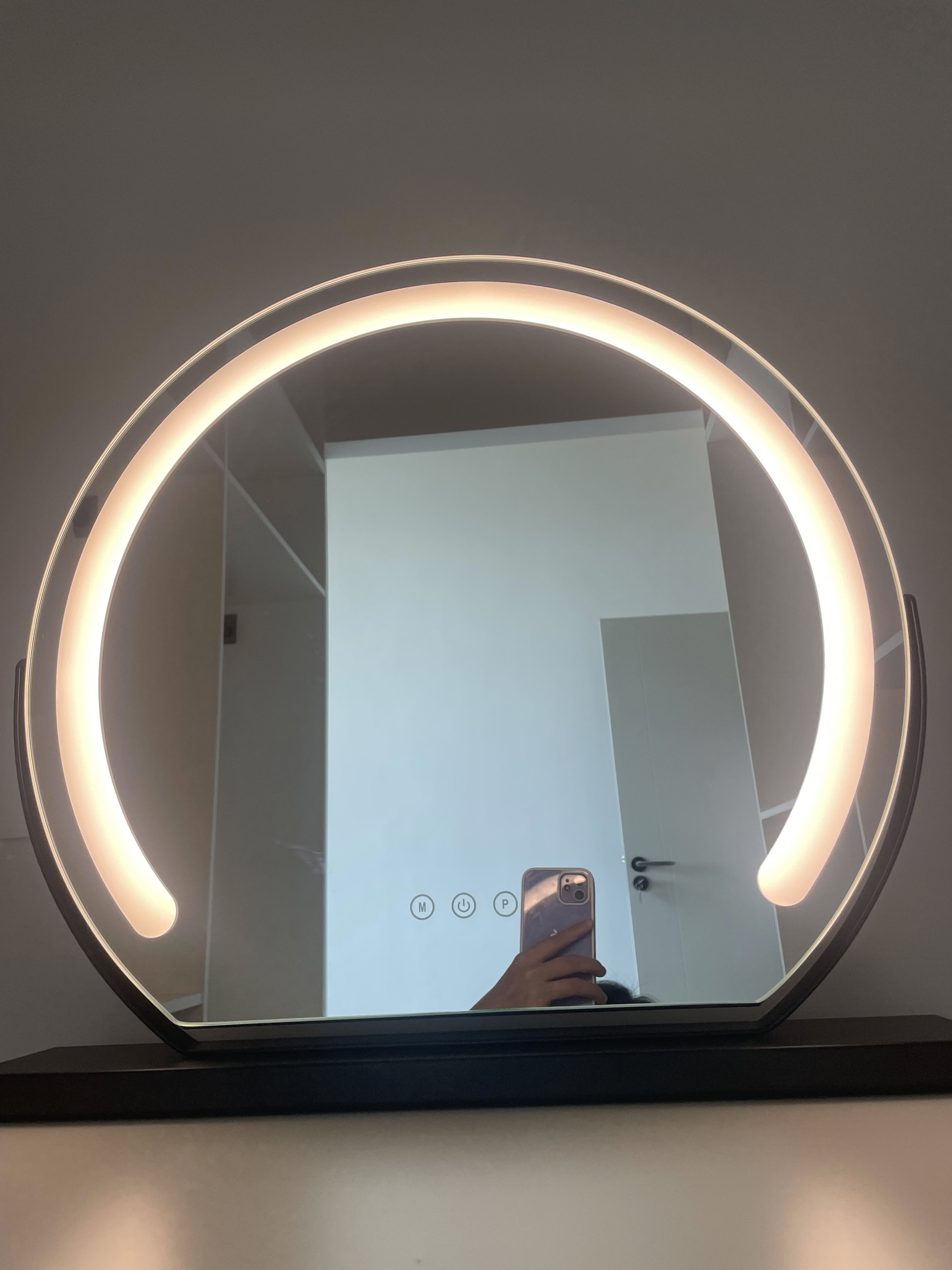 Dieser Schminkspiegel ist ein Muss für meine Make-up-Routine! Kann auf den Tisch gestellt werden und bietet trotzdem Platz für andere Dinge! Dieser Spiegel verfügt über drei verschiedene Lichteinstellungen, sodass Sie ihn auf jede gewünschte Helligkeit einstellen können und er nicht dunkler wird, egal wie lange Sie ihn verwenden! Ich benutze diesen Spiegel seit drei Jahren und hatte noch nie Probleme mit der Dimmung der Helligkeit! Ich hatte eigentlich keine Probleme mit diesem Produkt!