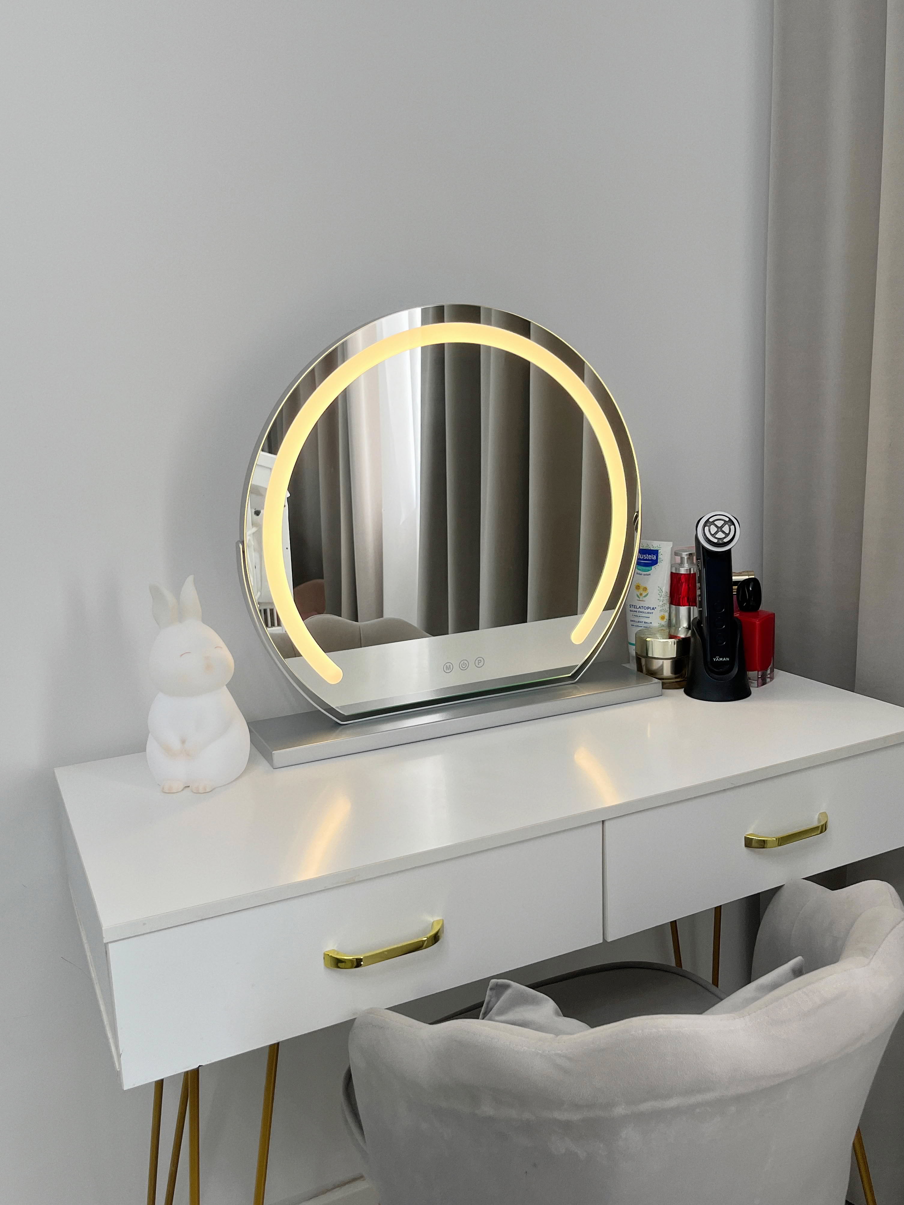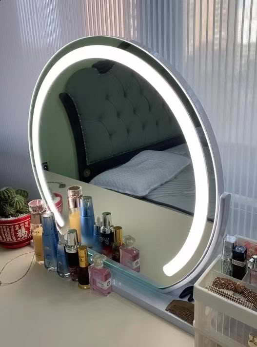 Dieser Schminkspiegel ist ein Muss für meine Make-up-Routine! Kann auf den Tisch gestellt werden und bietet trotzdem Platz für andere Dinge! Dieser Spiegel verfügt über drei verschiedene Lichteinstellungen, sodass Sie ihn auf jede gewünschte Helligkeit einstellen können und er nicht dunkler wird, egal wie lange Sie ihn verwenden! Ich benutze diesen Spiegel seit drei Jahren und hatte noch nie Probleme mit der Dimmung der Helligkeit! Ich hatte eigentlich keine Probleme mit diesem Produkt!