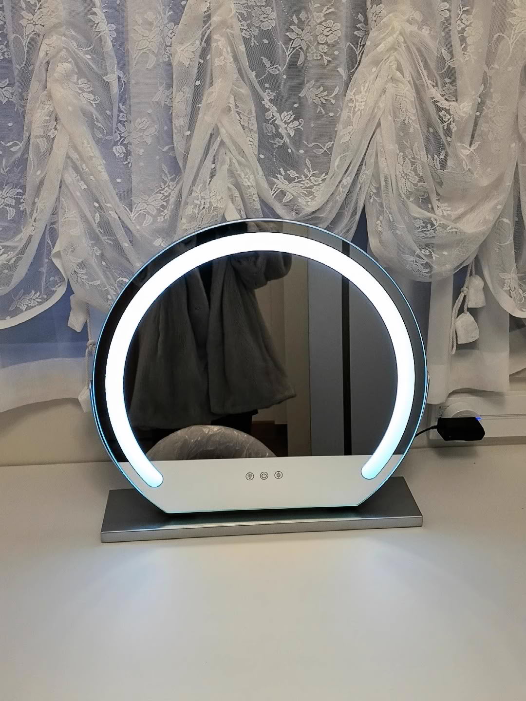 Ich stehe morgens auf und stelle diesen eleganten Spiegel auf meinen Beistelltisch. Das Design ist modern, aber die weiße Farbe und die glatten Linien verhindern, dass er aufdringlich wirkt. Ich wünschte, es könnte ohne Kabel funktionieren, ich habe nicht viele Steckdosen. Ich bin wirklich beeindruckt von der Lichteinrichtung, ich kann den Spiegel nach oben und unten neigen, was sehr praktisch ist!