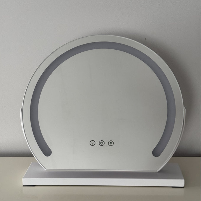 Dieser Spiegel ist perfekt. Die Größe passt perfekt auf den Schreibtisch. Einfach zu installieren. Die Helligkeit ist perfekt. Einfacher An- und Ausschalter. Hat drei verschiedene Einstellungen für unterschiedliche Beleuchtung. Die Reinigung ist ein Kinderspiel und er ist leicht, aber robust.