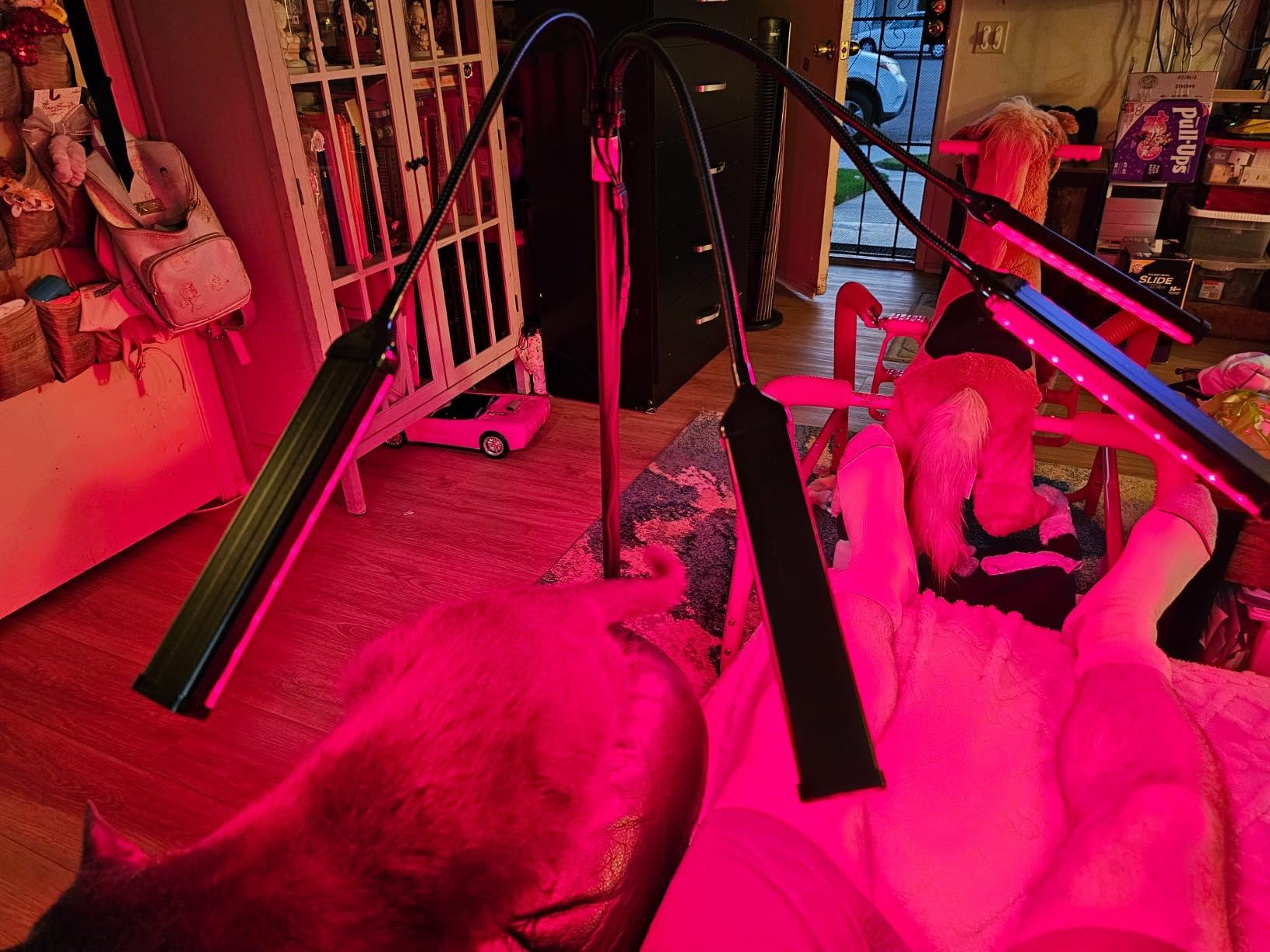 Ich glaube, ich habe gelesen, dass sie bei ihren Experimenten mit den Lampen festgestellt haben, dass Narben auf ihrer Haut, die dem Licht ausgesetzt waren, schneller heilten als erwartet. Ich habe mit einem kleineren Rotlichtgerät für mein Gesicht angefangen und schon bald einige Vorteile bemerkt – einen ebenmäßigeren Teint und ein etwas strahlenderes Aussehen.