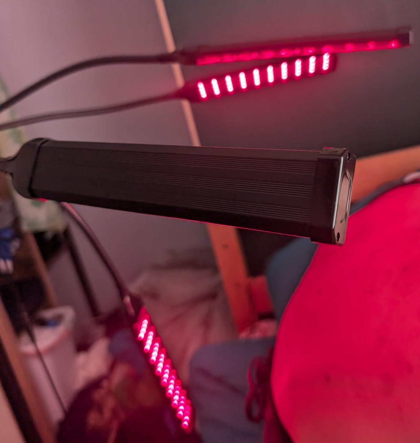 Dieses Panel erfüllte bisher meine Erwartungen an den Komfort, den ich suchte. Ich kann während der Therapie lesen oder mich ausruhen. Mir gefällt auch, dass ich die Lampen in verschiedene Richtungen einstellen kann. Da mein Bett etwas hoch ist, hat es gut geklappt, den richtigen Abstand zwischen den Lampen und meinem Körper zu finden, der einige Zentimeter entfernt sein muss.